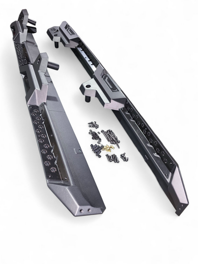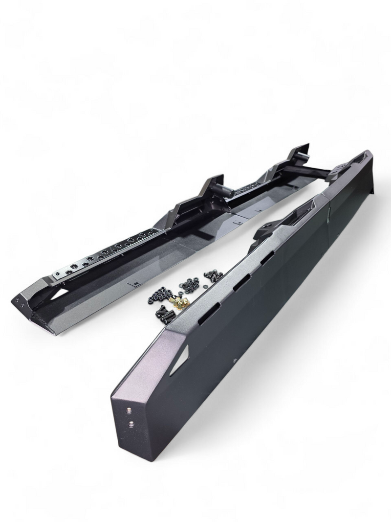 The Elektric Offroad Designs Volt Series 2016+ Can-am Defender HD10 Volt Rocker Steps provides added protection to your side by side. Our sliders give added protection to the Defender's body when squeezing through tight places on your run. Our built-in step function with grip plating allows for traction. These steel sliders are finished in a hammer black powder coat and the aluminum accent plates are finished in a satin black powder coat. Installation features a simple bolt-on process.