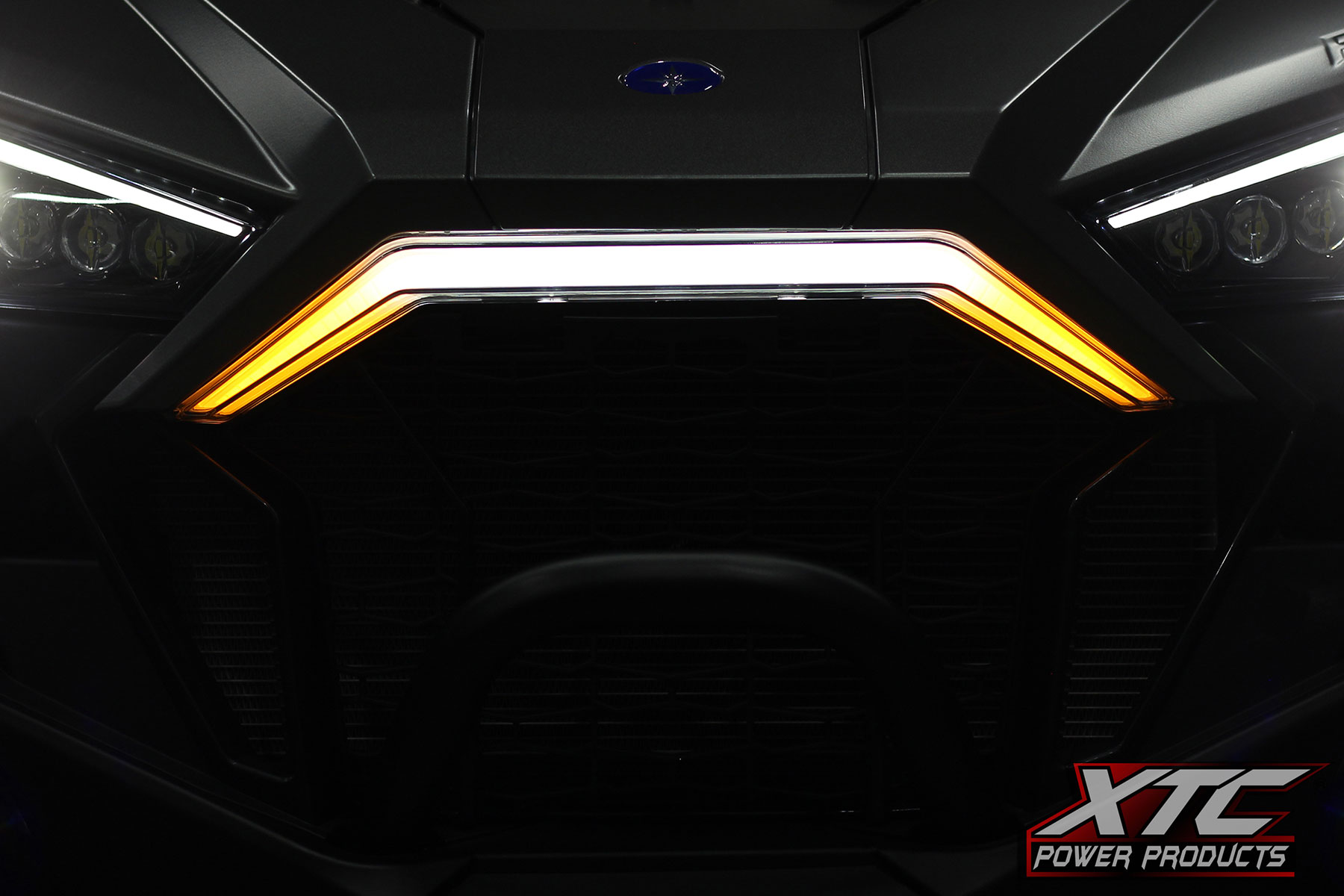 XTC Front Turn Signature Accent Light for Polaris RZR Pro Models. Our replacement accent light is a complete assembly that replaces the Polaris RZR Turbo R factory accent light with a Plug and Play accent light with amber turn signal/hazard lights built-in. The light plugs directly into the factory RZR Pro harness allowing the running light to come on and off with the key. A secondary input takes the turn signal plug from our popular ATS-POL-M10/ATS-POL-M24 turn signal system. When the vehicle’s turn signal is activated the outer portion of the accent light will flash amber indicating a left or right turn. XTC® Power Products Leads the way in UTV Wiring Solutions. XTC Gets You Wired For Fun!