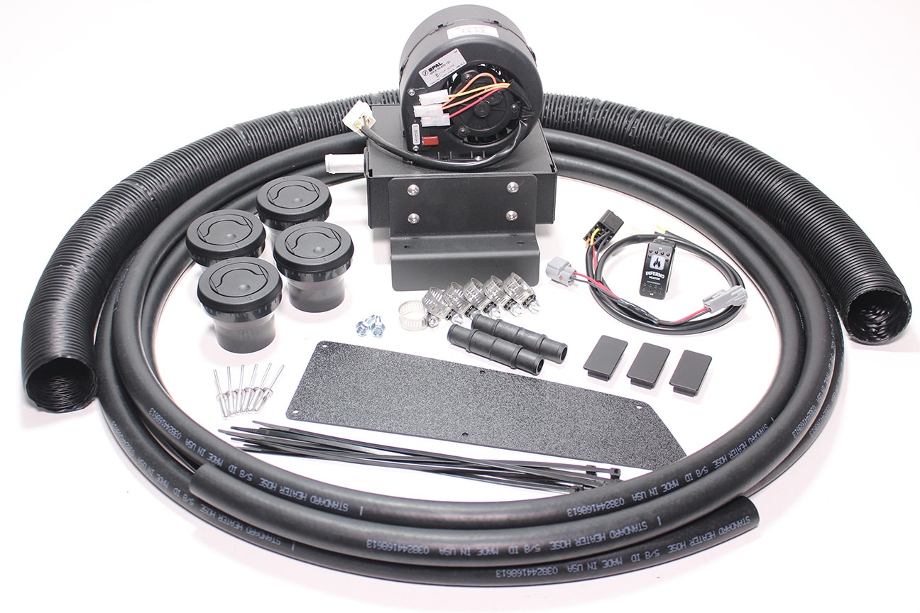 - Includes all necessary components: heater hose, hose splicers, hose clamps, mounting brackets, defrost and floor louvers, ductwork & wiring.