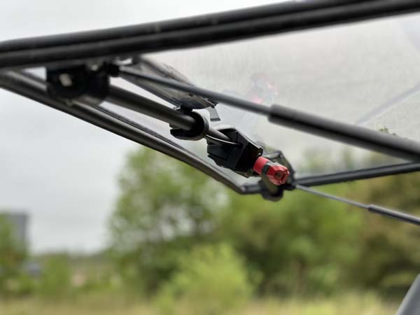 Spherical ball rod ends are utilized as self-aligning hinges along the top of the windshield, allowing for the windshield to pivot freely throughout its range of motion and minimize any binding that may occur. The center retainer and rub plate act as an upper hinge point and helps minimize oscillation when riding with the windshield in the opened position.
