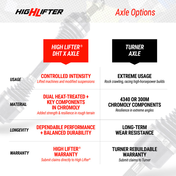 - What are the differences between the High Lifter Axle and the Turner Axle options? The High Lifter DHT axle options are constructed using dual heat-treated chromoly components, whereas the Turner Axles are made from 4340 or 300M chromoly components. The Turner options are usually more expensive but they are ideal for extreme mud, racing, and high-horsepower applications.