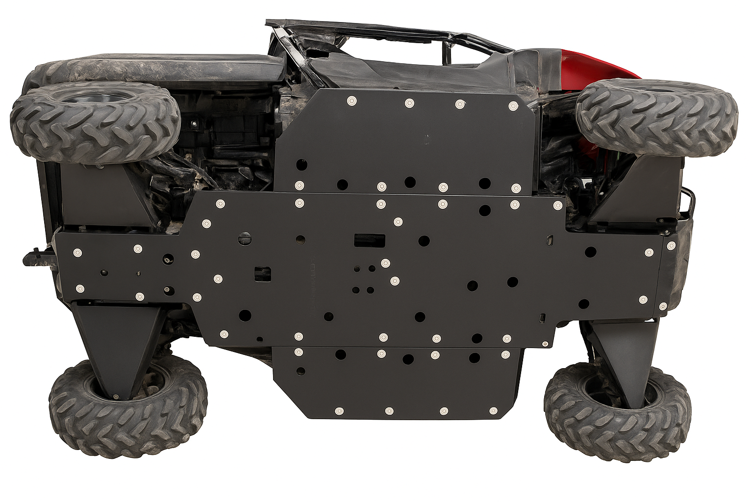 Trail Armor's full skid plate set for the Honda Pioneer 700 2014 - 2024. Made from 1/2" supertough polymer, these plastic skids absorb shock to the bottom of the vehicle with no dents or rust and are lighter than traditional metal skids.